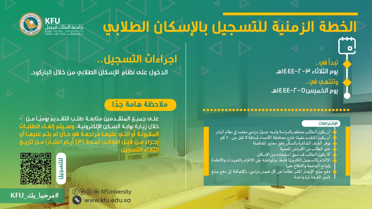 وإشارة إلى إن كافة الغرف في السكن الجامعي حالياً يسكنها طلبة سابقون ومستمرون في الدراسة, أردنا إشعاركم بذلك مبكراً حتى يتسنى لكم إجراء الترتيبات الخاصة فيكم فيما يتعلق بالسكن.