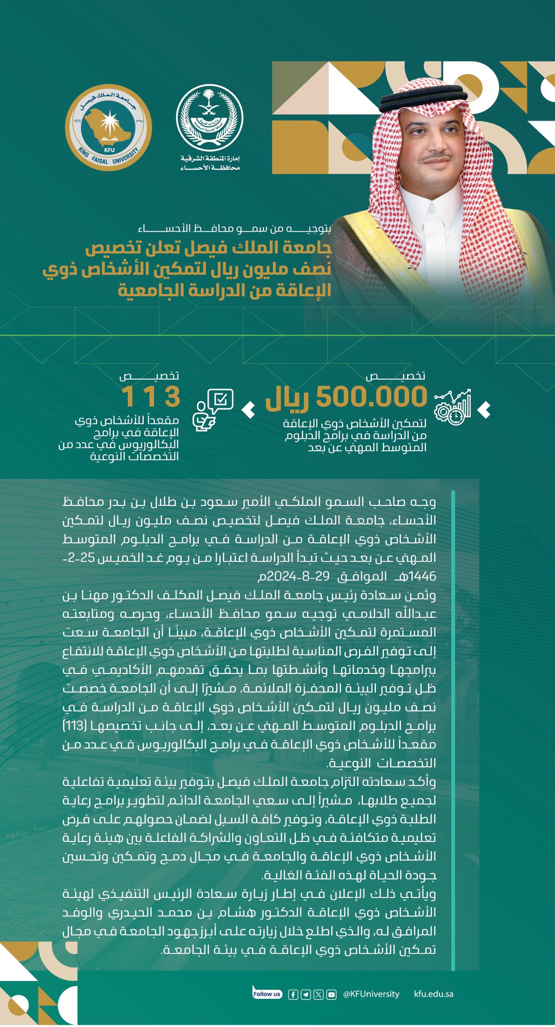 جامعة الملك فيصل تمنح 113 مقعد مخصص لذوي الاحتياجات الخاصة بمبلغ دعم 500 ألف ريال