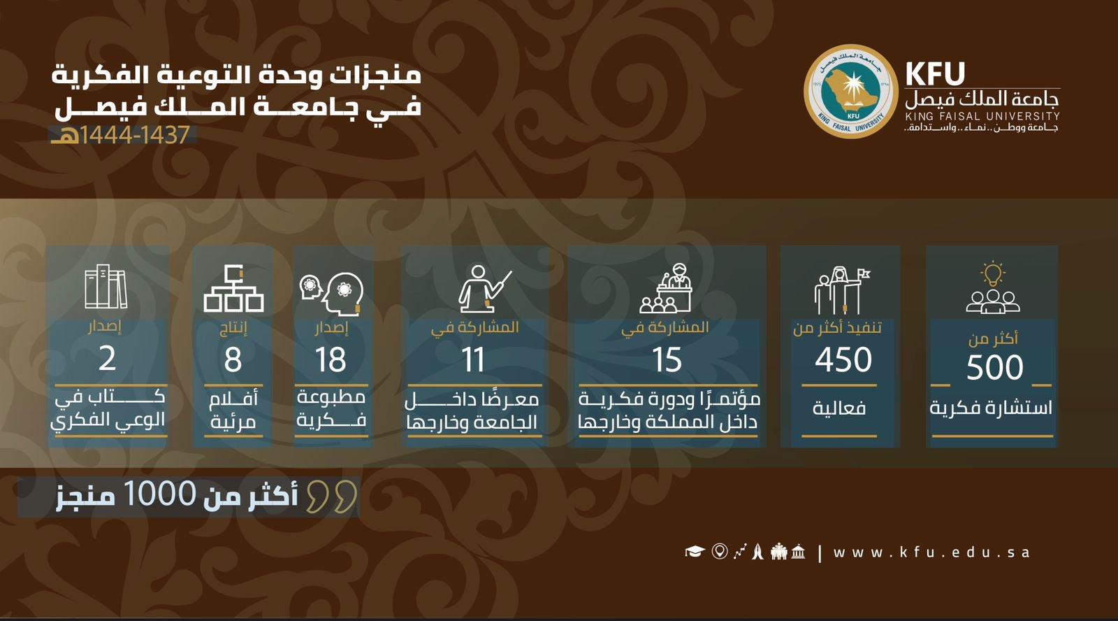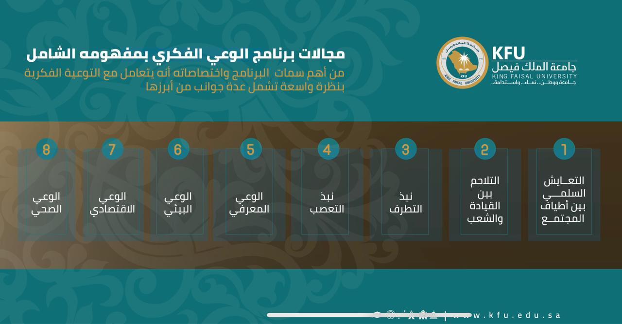 تقوم جامعة الملك فيصل ممثلة بوحدة التوعية الفكرية بتعزيز روح الانتماء والحب للوطن بكافة أشكاله و نشر مبادئ التعايش السلمي ونبذ التعصب و زيادة الوعي في جميع جوانبه ونشر المبادئ المتعلقة بالفساد والرشوة والجريمة.