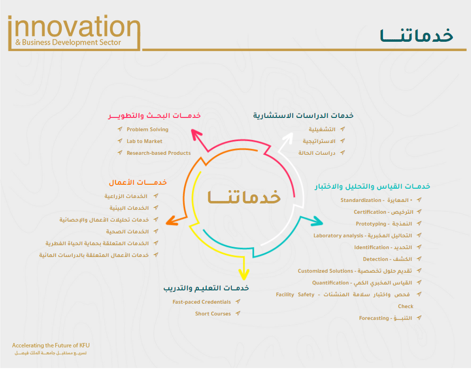 يقوم قطاع الابتكار وريادة الأعمال في الجامعة بتقديم مجموعة من الخدمات للقطاع الخاص والصناعي ومنها الخدمات البيئية