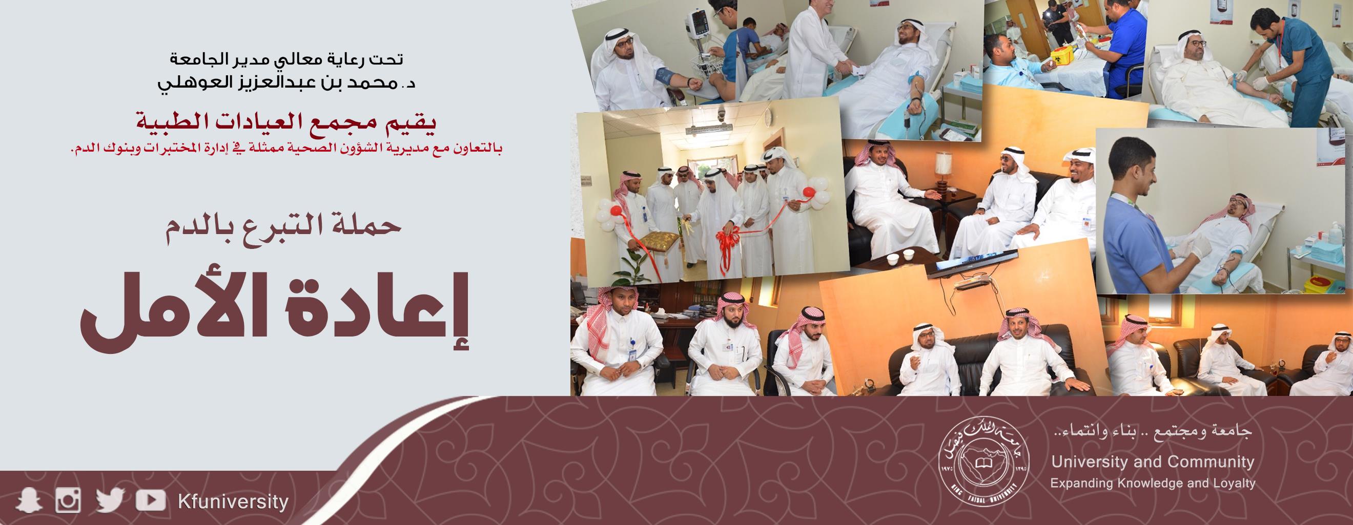 في سبيل تعزيز دور مجمع العيادات الطبية المجتمعي في خدمة المجتمع والتعاون مع القطاعات الصحية الأخرى والتعريف بصحة الفرد والمجتمع والمساهمة بسد النقص في بنوك الدم قامت الجامعة بحملات تبرع بالدم بالتعاون مع مستشفى الحرس الوطني في الاحساء