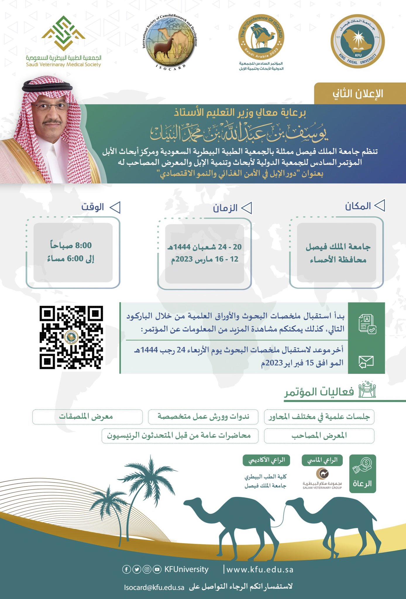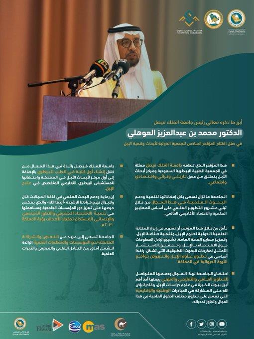 استضافت جامعة الملك فيصل أعمال المؤتمر الدولي السادس للجمعية الدولية لأبحاث وتنمية الإبل تحت شعار"دور الإبل في الأمن الغذائي والنمو الاقتصادي".