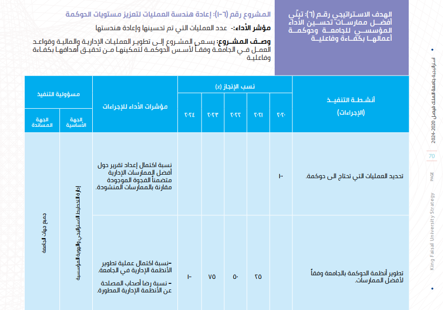 تعمل جامعة الملك فيصل ضمن خطة استراتيجية وبمشــاركة جميــع الشــركاء الداخلييــن والخارجييــن وأصحاب المصلحة لرصــد الواقــع والتخطيط للمســتقبل وفق أفضــل منهجيات وممارســات التخطيــط الاســتراتيجي فــي مؤسســات التعليــم العالــي، وبمــا يضــع جامعــة الملــك فيصــل فــي المرتبــة األكاديميــة التــي تليــق باســمها وإرثهــا الممتــد إلــى مــا يربــو علــى نصــف قرن مــن الزمــان، وبمــا يعظم مــن تأثيرهــا علــى مســتوى مجتمعهــا المحلــي وعلــى المســتوى الوطنــي فــي مجــاالت التعليــم والتعلــم والبحــث العلمــي والشــراكة المجتمعيــة، بالاضافــة إلــى الابتــكار وتنميــة الاعمــال