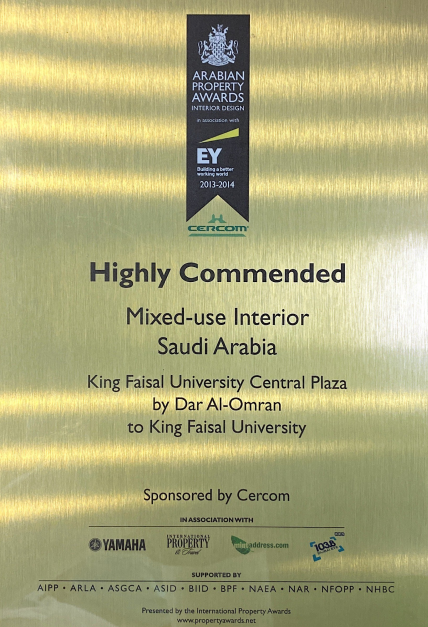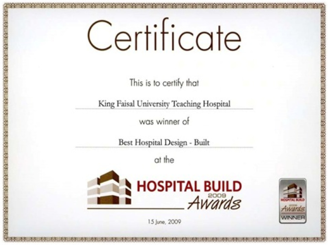أحد الشهادات الممنوحة لجامعة الملك فيصل من أفضل المؤسسات تطبيقا لشروط البناء للمشفى الجامعي