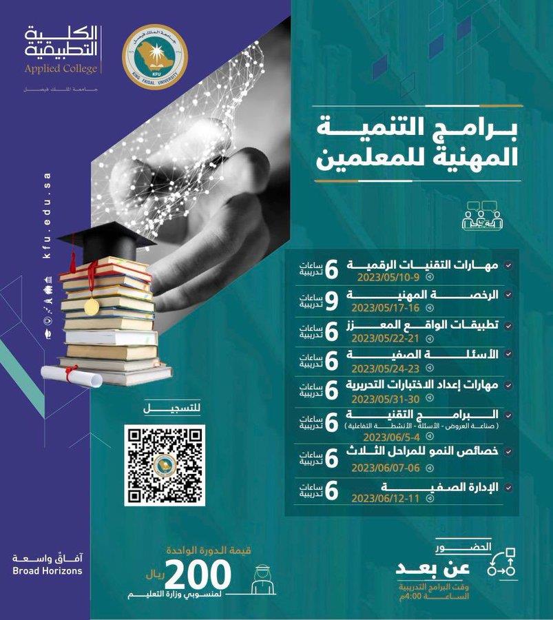 سعياً لتحقيق التنمية المستدامة والتطوير المهني للعاملين في مجال التعليم تقوم الكلية التطبيقية في جامعة الملك فيصل بتقديم سلسلة من البرامج التدريبية المهنية للمعلمين والمعلمات في سبيل تطوير المهارات في إعداد وتأهيل المتدربين