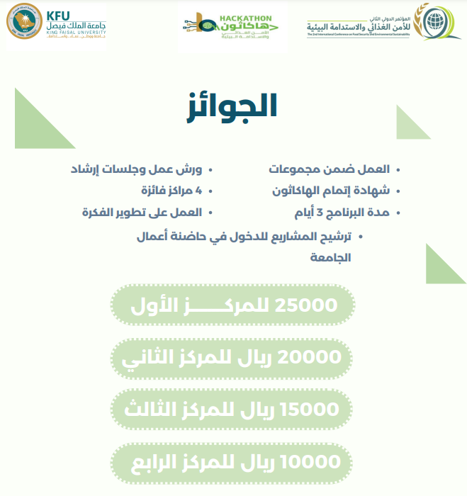 في نسخة 2023 أعلنت جامعة الملك فيصل عن فوز أربعة مشاريع في اختتام فعاليات هاكاثون الأمن الغذائي والاستدامة البيئية وتوج بالمركز الأول مشروع “نظام مدمج معزز بإنترنت الأشياء يستخدم بوليمير حيوي مستدام ١٠٠٪ لترشيد مياه الري”، قدمه فريق طلابي من جامعة الملك فيصل، وحصل على المركز الثاني مشروع “نمو واستدامة” لفريق مشترك من جامعة الإمام عبدالرحمن بن فيصل وجامعة الملك فهد للبترول والمعادن، وفاز بالمركز الثالث مشروع Garbage Manager لفريق مكون من الهيئة العامة للطيران المدني وجامعة الملك فيصل وجمعية فتاة الأحساء، فيما حقق المركز الرابع مشروع “جهاز استشعار حيوي لتحليل نمو النباتات لتصميم علاج جيني” والمقدم من فريق جامعة الملك عبدالله للعلوم والتقنية KAUST، وجامعة الملك فيصل.