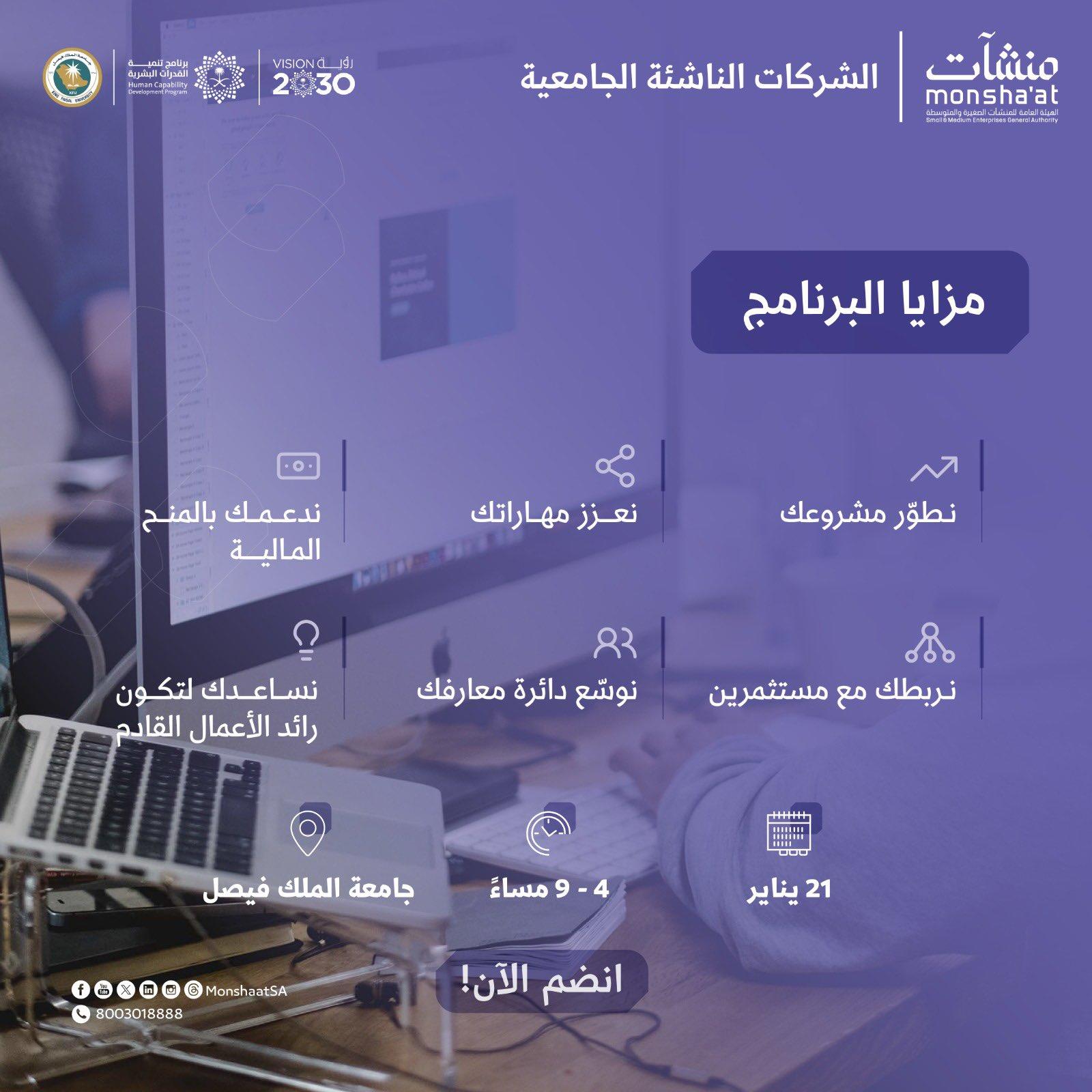 تعمل جامعة الملك فيصل بالتعاون مع الهيئة العامة للمنشآت الصغيرة والمتوسطة "منشآت "على إعداد وتنفيذ ودعم البرامج والمشاريع لنشر ثقافة وفكر العمل الحر وروح ريادة الأعمال والمبادرة والابتكار، وتنويع مصادر الدعم المالي للمنشآت، وتحفيز مبادرات قطاع رأس المال الجريء، وتقديم الدعم الإداري والفني للمنشآت، ومساندتها في تنمية قدراتها الإدارية والفنية والمالية والتسويقية والموارد البشرية وغيرها.