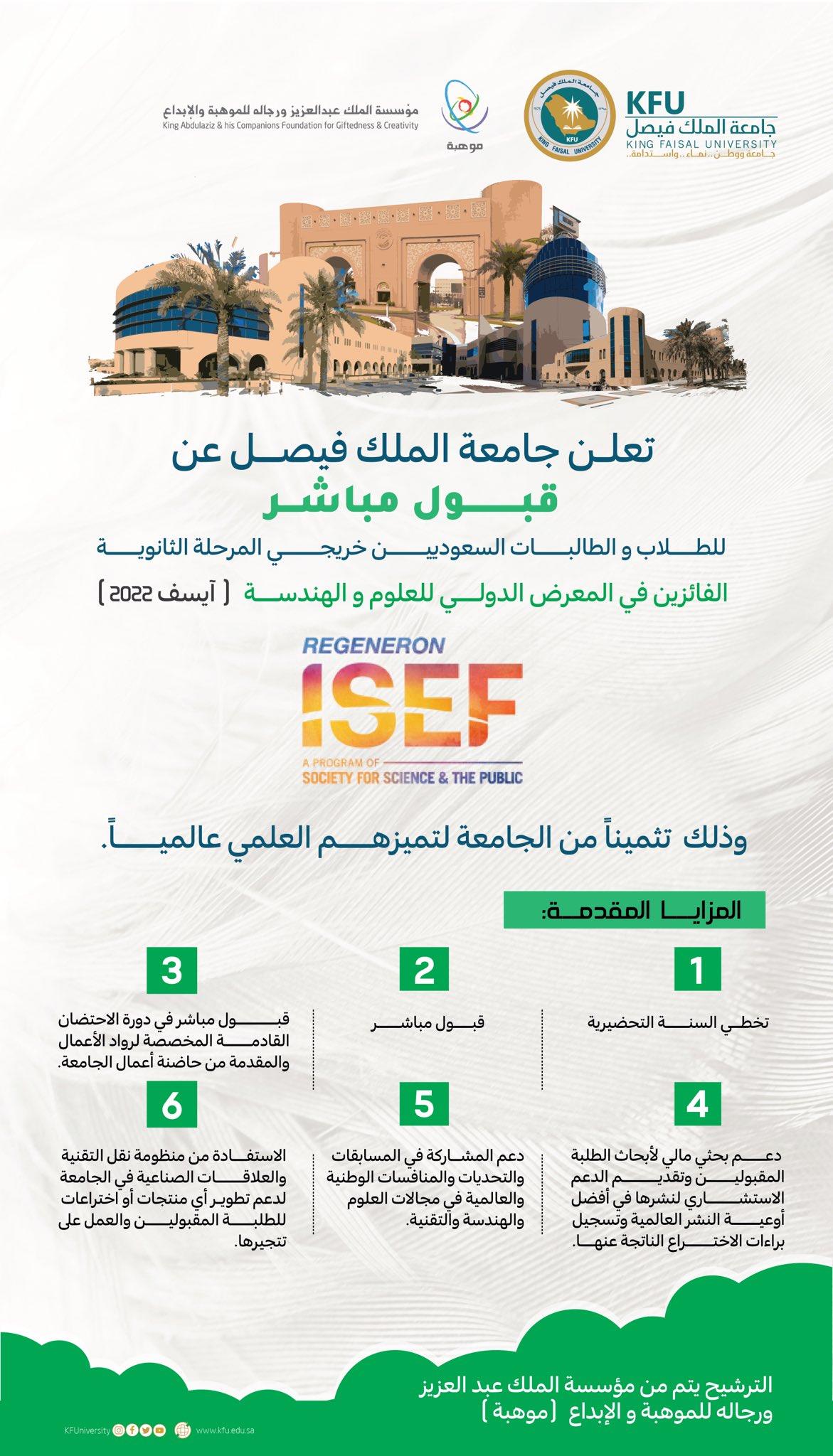 سعيا من جامعة الملك فيصل لاستقطاب الطلاب المتميزين خريجي المرحلة الثانوية وتبنيهم لتطوير مهاراتهم العلمية والعملية، فخصصت مجموعة من المزايا لهم في الجامعة. فقد قامت بالقبول المباشر للطلاب والطالبات خريجي المرحلة الثانوية الفائزين في المعرض الدولي للعلوم والهندسة “آيسف 2022″. وقدمت لهم 6 مزايا وهي: تخطي السنة التحضيرية، والقبول المباشر للطلاب، والقبول المباشر في دورة الاحتضان القادمة المخصصة لرواد الأعمال والمقدمة من حاضنة أعمال الجامعة. كما تضمنت المزايا دعما بحثيا ماليا لأبحاث الطلبة المقبولين وتقديم الدعم الاستشاري لنشرها في أفضل أوعية النشر العالمية وتسجيل براءات الاختراع الناتجة عنها، ودعم المشاركة في المسابقات والتحديات والمنافسات الوطنية والعالمية في مجالات العلوم والهندسة والتقنية، والاستفادة من منظومة التقنية والعلاقات الصناعية في الجامعة لدعم تطوير أي منتجات أو اختراعات للطلبة المقبولين والعمل على تتجيرها.