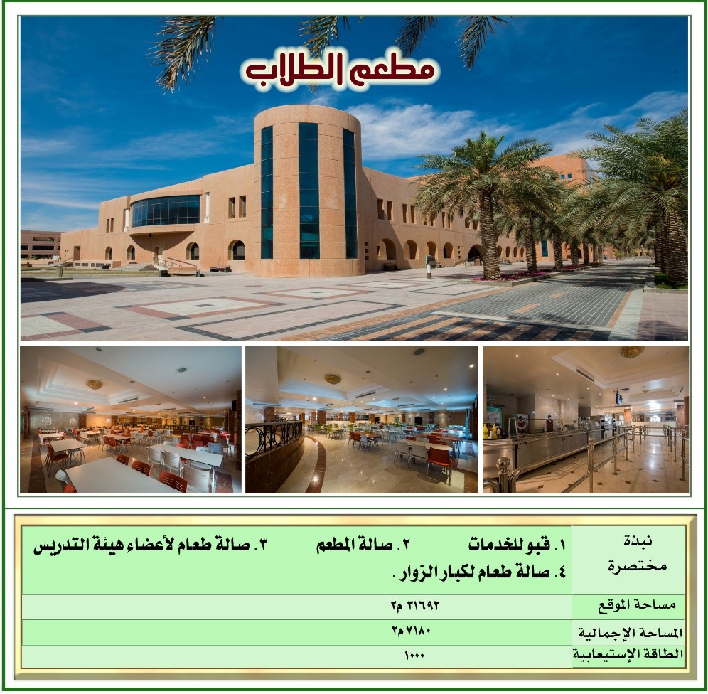 يتوفر في الحرم الجامعي مطعم الجامعة الذي يوفر خدمات غذائية متميزة ومتنوعة تلبي احتياجات الطلبة وتحقيق الحد الأدنى من الاحتياجات الغذائية للطلبة ذوي الدخل المحدود. وتقوم إدارة التغذية والإسكان الطلابي بالإشراف على تحديد الاحتياجات لخدمات التغذية المطلوبة في الجامعة والإشراف على عمليات التعاقد مع الشركات المتخصصة في تقديم الخدمات الغذائية. وكذلك العمل على نشـر الوعي الغذائي من خلال البرامج التثقيفية والتوعوية وتوفير فرص التدريب الميداني للطلاب المتخصصين في مجال التغذية.