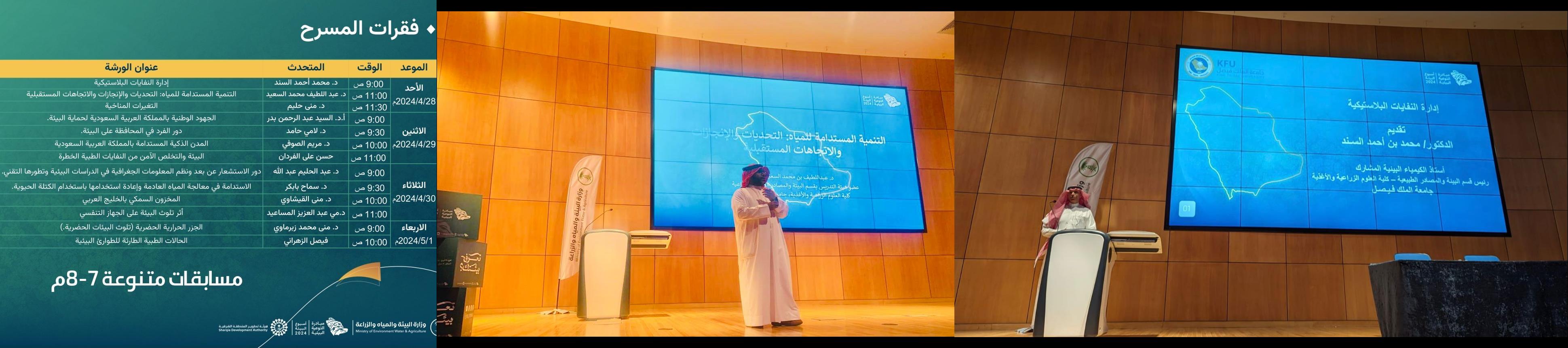 شارك قسم البيئة والمصادر الطبيعية الزراعية بكلية العلوم الزراعية والأغذية في تقديم عدد من ورش العمل بالتعاون مع هيئة تطوير المنطقة الشرقية بمقر الهيئة بمدينة الخبر ضمن فعاليات أسبوع البيئة السعودي 2024م، على مدى 4 أيام . وقد تضمنت مشاركات القسم في الفعالية بتقديم عدد من ورش العمل وهي: ورشة عمل بعنوان: "إدارة النفايات البلاستيكية" ، وورشة عمل بعنوان: "التنمية المستدامة للمياه (التحديات والإنجازات والاتجاهات المستقبلية)" ، وورشة عمل بعنوان: "الجهود الوطنية بالمملكة لحماية البيئة" ، وورشة عمل بعنوان: "دور الاستشعار عن بُعد ونظم المعلومات الجغرافية في الدراسات البيئية وتطورها التقني"، وورشة عمل بعنوان: "الاستدامة في معالجة المياه العادمة وإعادة استخدامها باستخدام الكتل الحيوية"، وورشة عمل بعنوان: الجزر الحرارية الحضرية (تلوث البيئات الحضرية)