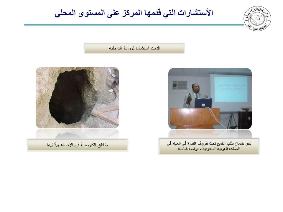 نظم مركز الدراسات المائية والبيئية في جامعة الملك فيصل دورة تدريبية بعنوان" الاستدامة في الموارد المائية" وذلك لمنسوبي المؤسسة العامة حيث تضمن التدريب مساعدة المهندسين في التعرف على أهمية دور الماء في النظام البيئي والاقتصادي ورفاهية المجتمع، و تعريفهم على الموارد المائية التقليدية والبديلة وانواعها والتوجهات العالمية في استخدامها من اجل الاستدامة والامن الغذائي، وتعريفهم على ازمة الموارد المائية محليا وإقليميا وعالميا والتحديات المحتملة وضرورة تنفيذ التشريعات والسياسيات لحلها، وتعريفهم على مبادئ الإدارة المتكاملة لاستدامة الموارد المائية وفقا لمبادئ مؤتمر دبلن العالمي للاستدامة عام 1992 ، وعلى القضايا والتحديات التي تواجه إدارة الموارد المائية في المملكة والمحاور الاستراتيجية لتنميتها والسياسات المائية من اجل استدامتها.